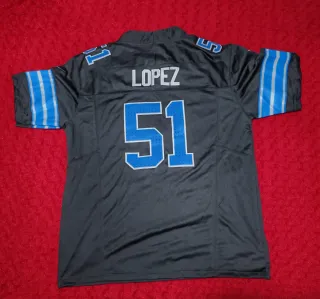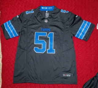 Camiseta de fútbol americano de los Detroit Lions. - Diseño con el número 51. - Detalles de Motor City en el cuello. - Mangas con franjas azules y grises.