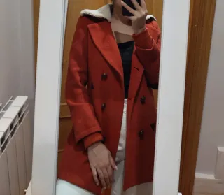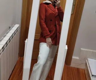 Parka de pana con un diseño moderno y abrigado. - Color principal naranja teja. - Cierre de botones. - Coderas - Cuello con borreguito que puede quitar y poner como se ve en la foto.