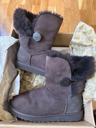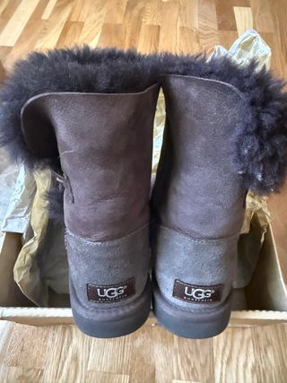 Botas UGG de caña media con forro de pelo. - Exterior de ante. - Detalle de pelo en la parte superior. - Logo de UGG en la parte trasera.