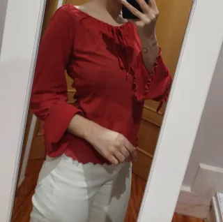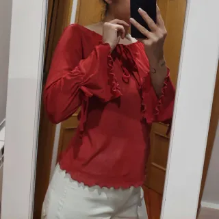 Blusa de manga larga con un diseño acampanado y detalles de volantes. - Tejido ligero y con brillo. - Escote con lazada. - Mangas abullonadas con volantes. - Bajo con acabado festoneado.