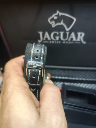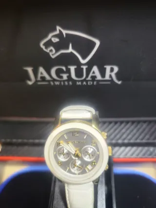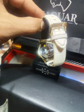 Elegante reloj de pulsera con correa blanca y detalles dorados. - Diseño moderno y sofisticado. - Esfera con marcadores horarios y subesferas. - Correa de piel con acabado texturizado.