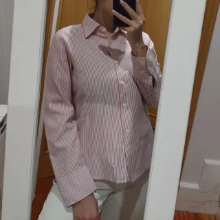 Camisa de rayas verticales en tonos rojo claro y blanco. Un clásico que no pasa de moda. - Cuello camisero. - Cierre de botones. - Puños abotonados.