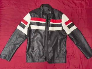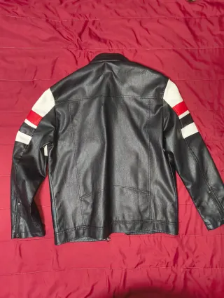 Chaqueta de cuero con un diseño llamativo y moderno. - Diseño de rayas en contraste en mangas y pecho. - Cuello estilo motorista. - Cierre de cremallera frontal. - Bolsillos laterales con cremallera.
