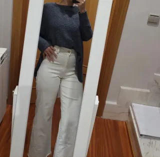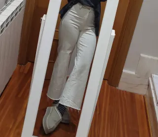 Pantalón de corte tobillero en color blanco crema - beige. - Aunque marca talla 46, talla como una 36-38 - Diseño acampanado. - Bajo deshilachado.