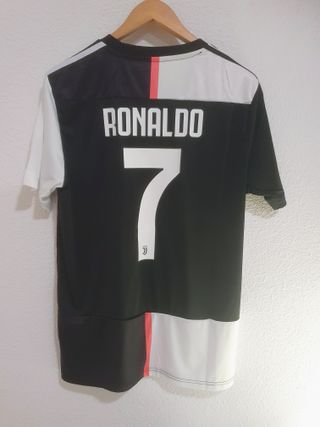 Camiseta de fútbol del Juventus con el dorsal 7 de Cristiano Ronaldo. - Diseño con paneles en negro, blanco y detalles en rojo. - Nombre RONALDO y número 7 en blanco en la espalda. - Logo de la Juventus en la parte inferior del número.