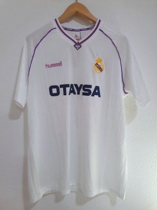 Camiseta de fútbol blanca con detalles morados y el patrocinador OTAYSA. - Logo de Hummel. - Escudo del Real Madrid.