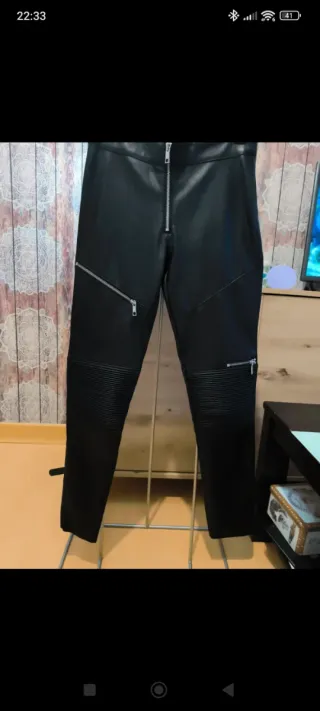 Pantalón estilo motero de polipiel. - Cremallera frontal. - Bolsillos con cremallera en los laterales. - Detalle de canalé en rodillas y tobillos.