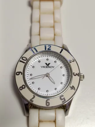Elegante reloj Viceroy con correa de silicona. La correa está en mal estado,habría que cambiarla,el reloj funciona perfectamente,sin pila - Diseño moderno y funcional. - Esfera clara y fácil de leer.