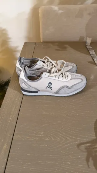 Zapatillas deportivas de estilo casual con un diseño distintivo. - Detalle de calavera y tibias cruzadas en el lateral. - Combinación de materiales en blanco y gris.