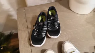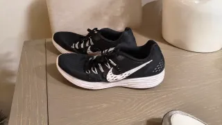 Zapatillas deportivas Nike en color negro con detalles blancos. Perfectas para correr o para el día a día. - Diseño moderno y ligero. - Suela blanca con líneas. - Logo de Nike en blanco.