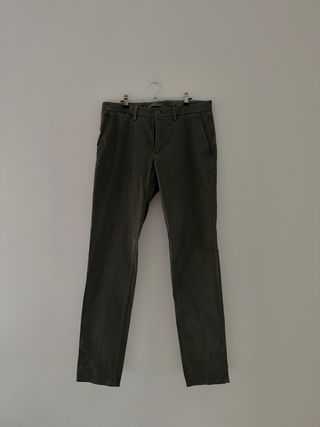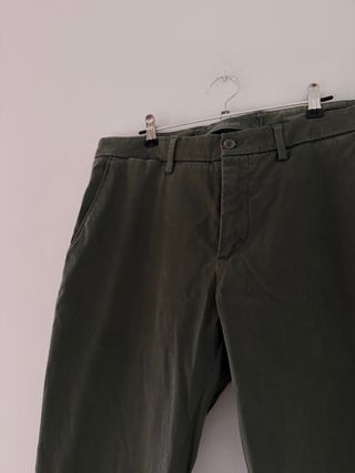 Pantalones de vestir en color verde oliva. - Corte recto. - Cierre de botón y cremallera. - Bolsillos laterales. - Bolsillos traseros. - Tejido de algodón.
