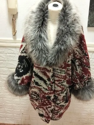 Chaqueta de lana con detalles de pelo. - Diseño multicolor con tonos rojos. - Acabado suave y cálido. Está nueva Abriga mucho Talla única pero sirve para 43_44