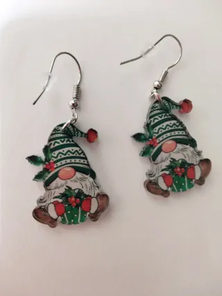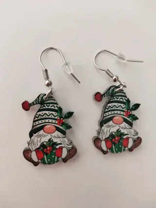 Originales pendientes con diseño de gnomo navideño con bayas rojas y hojas verdes. Cierre de anzuelo con tope de silicona. Medidas aprox.: 4,7 x 2,2 cm