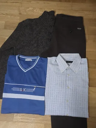 Camisa de manga larga de cuadros talla 4,mide de ancho 59 cm y de largo 74 Jersey marrón talla L ,Tex ,mide de ancho 54 cm y de largo 69 cm Camiseta de manga corta azul, talla L , mide de ancho 52 cm y de largo 68 cm Pantalón marrón,es talla L ,pero no tiene la talla,mide de cintura 43 cm ,de largo 99 cm y de bajo 22 cm TE INVITO A VISITAR MI SEGUNDO PERFIL. UNE TODOS LOS ARTÍCULOS QUE TE GUSTEN Y PAGA UN SOLO ENVÍO #lotederopahombre #pantalonesdehombre #camisasdehombre
