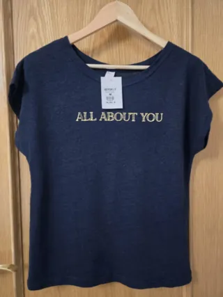 Camiseta de manga corta con un diseño moderno y un mensaje llamativo.Estampado dorado All About You. Color azul marino. Mide de sisa a sisa 46 cm y de largo 60 cm. HAGO ENVÍOS