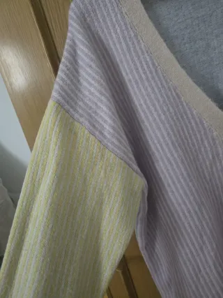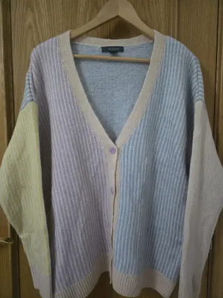 Chaqueta de punto con diseño de bloques de color y rayas verticales. Mide de sisa a sisa 63 cm y 66 cm de largo. La etiqueta marca la talla L pero es mucho más grande. HAGO ENVÍOS