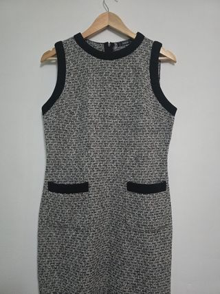 Vestido de tejido tipo tweed con detalles en negro.Dos bolsillos frontales con ribete negro.Mide de sisa a sisa 48 cm y de largo 85 cm. Tiene cremallera invisible en la parte de la espalda. Totalmente nuevo. VISITA MI PERFIL TENGO MÁS MODA. HAGO ENVÍOS