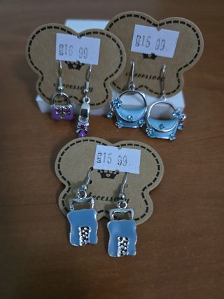 Conjunto de pendientes con diseños divertidos y originales.Pendientes con forma de bolso.Pendientes con forma de zapato de tacón.Detalles en color morado y azul. Miden aproximadamente 2 cm. VISITA MI PERFIL TENGO MÁS MODA. HAGO ENVÍOS