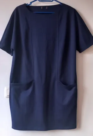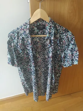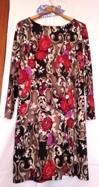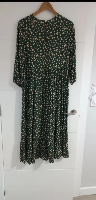 Vestido de talla L con un llamativo estampado floral. - Diseño con fondo verde y flores blancas con centros oscuros. - Mangas cortas con volantes. - Bajo con godes a los lados para darle movimiento. - Cuello redondo.