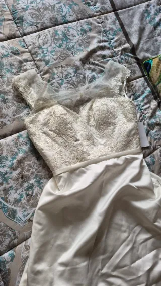 Elegante vestido de Sfera con detalles de gasa y bordado en hilo dorado. - Diseño con cuerpo de gasa semitransparente. - Falda con intrincado bordado floral y de volutas. - Acabado con detalles metálicos en el bordado.