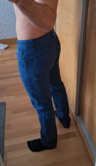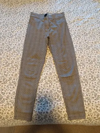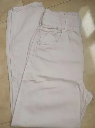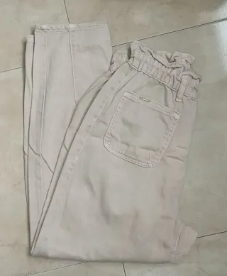 Pantalones vaqueros grises, confeccionados en 100% algodón. Presentan un diseño desgastado con rotos en las rodillas y en la zona del muslo. - Cintura alta. - Cierre de cremallera y botón. - Bolsillos delanteros y traseros. Me equivoqué comprando la talla y no los puedo devolver. Están totalmente nuevos, sin usar.
