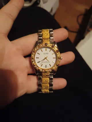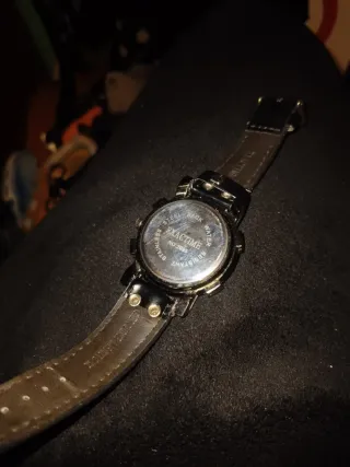 Reloj de pulsera con una esfera degradada de azul a blanco y detalles plateados. Funciona perfectamente automatico - Caja y correa de metal plateado. - Indicador de día y fecha.
