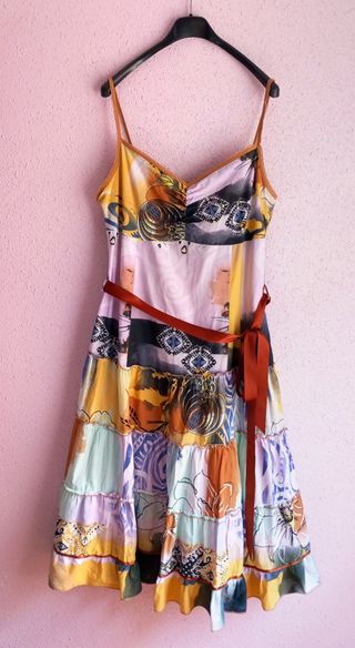 Exclusivo de boutique de Paris. Marca: Chichi's. Motivos de cebras y hojas en tonos beige, verde y blanco. Escote en V con nudo en el pico. Falda con forro y vuelo. 120ancho. 43cintura. 46sisa. Precio no negociable.