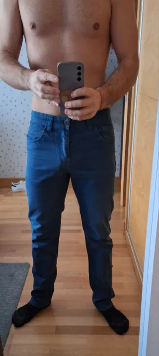 Pantalón largo de corte recto. - Diseño de cinco bolsillos. - Cierre de cremallera y botón. - Trabillas para cinturón.