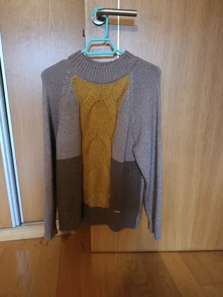 Jersey de punto de la marca Trucco en talla L. Presenta un diseño con bloques de color y un detalle de trenzado en la parte delantera. - Diseño de bloques de color. - Detalle de trenzado en el delantero. - Cuello redondo. - colores tierra