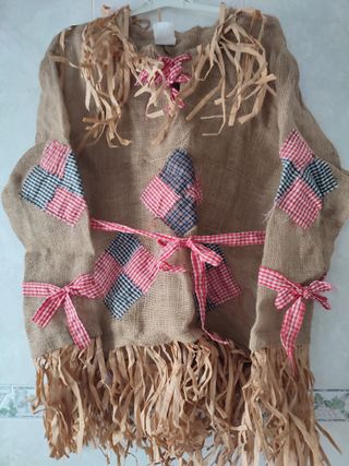 Disfraz de espantapájaros con un diseño rústico y divertido. - Tela de saco con parches de cuadros. - Adornado con lazos de cuadros rojos y blancos. - Detalles de paja. - Incluye sombrero negro.