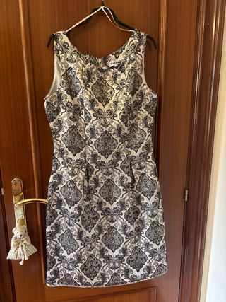 Elegante vestido de fiesta con un diseño damasco en hilo dorado. - Diseño sin mangas. - Corte a la cintura. - Largo hasta la rodilla.