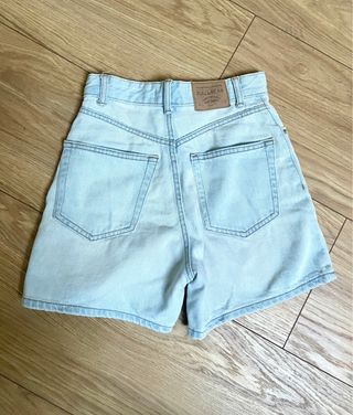 Pantalones cortos vaqueros de color azul claro estilo mom fit. Tienen un corte moderno y son cómodos para el día a día. - Cintura alta. - Bolsillos delanteros y traseros. - Cierre de botón y cremallera.