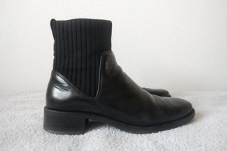 Botines marca Unisa de color negro. Exterior e interior de cuero. Suela de goma. Están un poco usados, como se puede ver en las fotos, con algunas arrugas y roces, pero con la piel brillante y el dibujo casi completo en las suelas. El cuero es blando y adaptable y tiene una pequeña caña flexible estilo calcetín con tiradores para adecuarse mejor al tobillo. Pueden ser unisex. PRECIO NEGOCIABLE