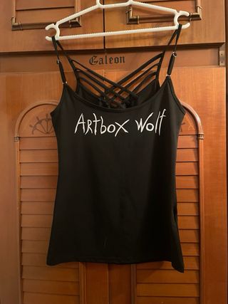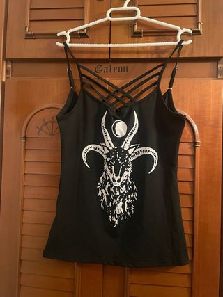 Top de estilo gótico con un llamativo estampado. - Diseño con tirantes finos y espalda cruzada. - Estampado frontal. - Usada 1 vez. - Talla S.