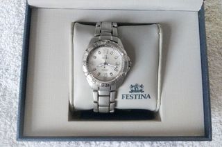 Reloj Festina F16171/7 analógico para mujer con movimiento de cuarzo, correa de acero inoxidable y resistencia al agua. Tipo de correa: Acero inoxidable Tipo de cristal: Mineral Diámetro de la caja: 36 mm Resistencia al agua: 100m Grosor de la caja: 11 mm Ancho correa: 18 mm Color del dial: blanco Color de la correa: Plateado mate con detalles cromados Características extra: Calendario, corona giratoria Accesorios extra: eslabones extra, correa de piel azul sin estrenar Actualmente tiene pila y está funcionando. Tiene 20 años y marcas de uso en la correa. El cristal no tiene rayones a pesar del uso. Incluye embalaje original.