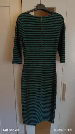 Vestido de manga tres cuartos con un diseño de rayas verticales. - Diseño de rayas horizontales en verde y negro. - Corte ajustado. - Cremallera en la espalda.