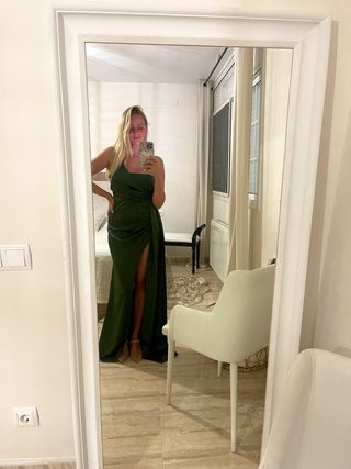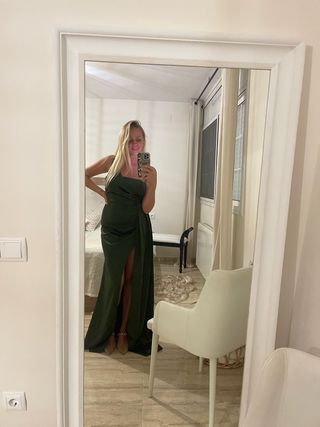 Elegante vestido largo, ideal para bodas o eventos especiales. - Diseño de un solo hombro. - Abertura lateral pronunciada. - Tejido satinado con caída. - Detalle drapeado en la cintura. Usado solo para UNA boda, lavado.