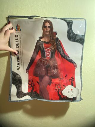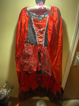 Disfraz de vampira estilo deluxe. - Diseño con capa roja y detalles en encaje negro. - Corsé con cordones. - Falda con brillo.