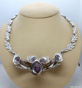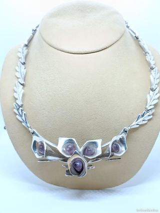 Elegante collar de plata 950, elaborado con técnicas de artesanía mexicana. Presenta un diseño floral con incrustaciones de amatista. - Plata 950. - Diseño floral. - Piedras de amatista. - Peso: 183 gramos