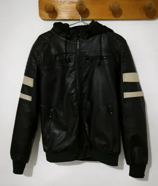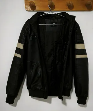 Chaqueta estilo motero con capucha y detalles de rayas blancas - Cierre de cremallera frontal - Dos bolsillos con cremallera en el pecho - Dos bolsillos inferiores - Bolsillo interior - Puños y cintura elásticos Talla L pero sirve para talla M. Se vende para darle una segunda vida si se quiere arreglar o para otros usos.