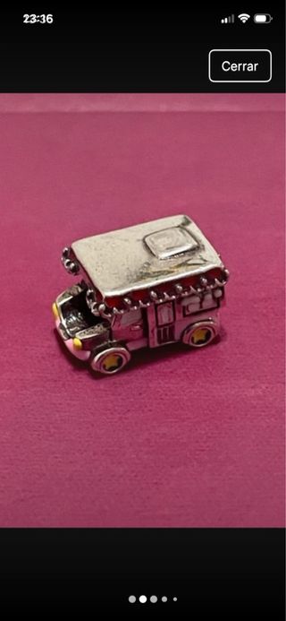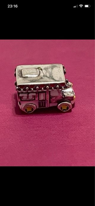 Charm con forma de autocaravana o coche antiguo, ideal para pulseras. - Diseño detallado de autocaravana. - Acabado en plata. - Detalles en color rojo y amarillo.