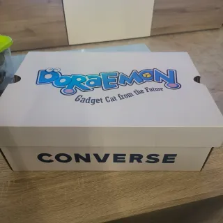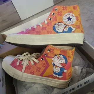 Zapatillas altas Converse con un divertido diseño de Doraemon. El estampado combina tonos naranjas y rosas con la imagen del personaje. - Modelo: Chuck Taylor All Star. - Estampado de Doraemon. - Diseño de caña alta. - Unisex.
