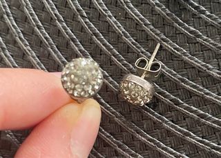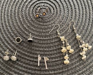 Lote de 5 pares de pendiente de diferentes medidas y materiales Hay alguno de plata (los más oscurecidos) - Pendientes con diseño de flor y detalle amarillo. - Pendientes de botón gris claro con circonitas. - Pendientes largos con cuentas blancas. - Pendientes de barra plateada. - Pendientes redondos de acero con circulo negro