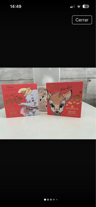 Set de dos paletas de colorete e iluminador de la colección Disney Classics de Essence. - Paleta con diseño de Dumbo. - Paleta con diseño de Bambi. - Acabado dorado y rosado.