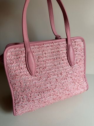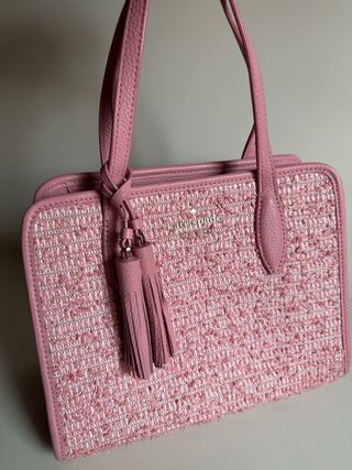 Bolso de mano Kate Spade con un diseño tejido en tonos rosas y blancos. Cuenta con asas de piel ,bordes, y flecos, resto de rafia, prácticamente nuevo sin uso, no tiene asa larga pero SI se le puede añadir. - Material exterior: tweed y piel. - Color: rosa y blanco. - Cierre: cremallera. - Interior: forro de tela.