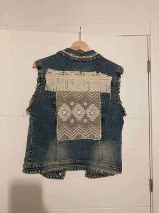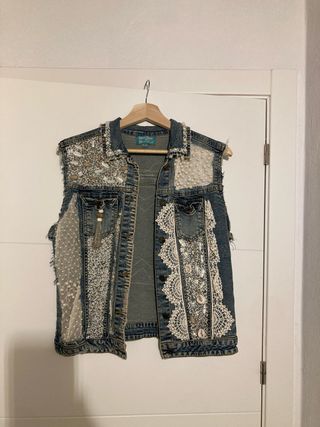 Chaleco vaquero de Amica Sartorio by Giacomo Conque, con un diseño único y detalles elaborados. - Adornos de encaje blanco. - Perlas y abalorios decorativos. - Flecos en los bordes. - Parches de tela y malla.