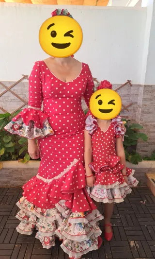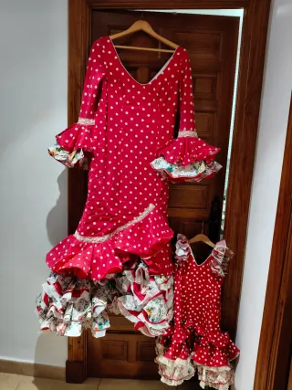 Conjunto de trajes de flamenca a juego para madre e hija. Diseños vibrantes y llenos de estilo. Talla 44 el grande y la 5 el d ella niña, pero tiene sacado para una 7. - Estampado de lunares rojos. - Volantes y detalles de encaje. - Adornos florales en la cabeza.