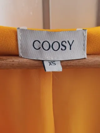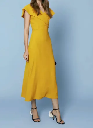 Vestido confeccionado en crepe color mostaza o amarillo. Escote en pico cruzado con maxi cuello, sin manga. Corte en la cintura, largo midi y falda fluida. Cierre con cremallera invisible lateral. Talla XS de la marca Coosy perfecto para cualquier evento como boda, trabajo, fiesta, bautizo o comunión. Se encuentra en perfecto estado, sólo fue usado en una ocasión.