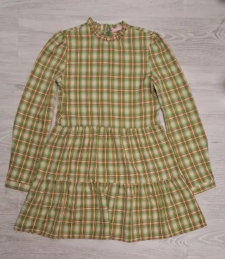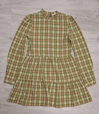 Vestido de la marca Kling con estampado de cuadros. - Diseño con cuello alto. - Mangas largas. - Falda con volantes en varios niveles.