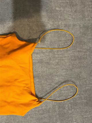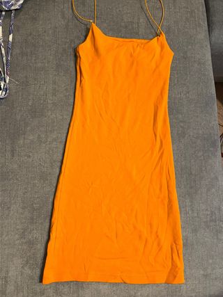 Vestido de tirantes en color naranja vibrante. Su diseño es sencillo y moderno, ideal para diversas ocasiones. - Corte ajustado. - Tirantes finos.